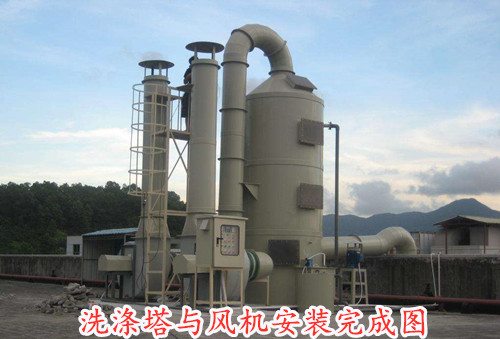 所需處理的廢氣由管道進入洗滌塔底部,與塔壁接觸后往上升,與噴淋裝置噴出的洗滌液發生中和反應,HX+NaOH=NaX+H2O。經過層層處理的廢氣達到洗滌塔頂部的除霧層除去氣體中含有的水氣,然后經由玻璃鋼離心風機排至大氣環境中。