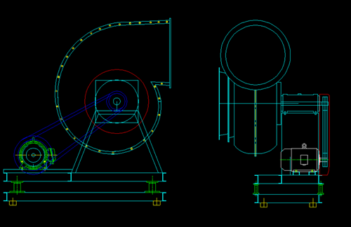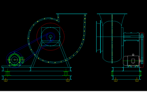 g、圖中展示的是C型的玻璃鋼離心式風(fēng)機,另外一種A型風(fēng)機不使用皮帶,風(fēng)機葉輪直接與電動機連接在一起,可以理解為電動機直接安裝在風(fēng)機架子的頂端,多余的部分可以省去。