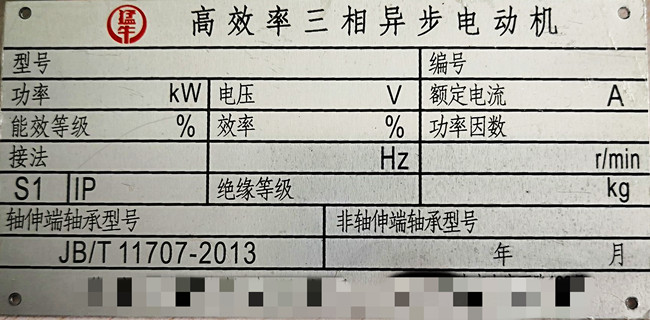 參照上圖中的電動機銘牌,在上面會詳細標準電動機的型號規格、生產編號、功率、電壓、額定電流、能效等級、效率值、絕緣等級、額定轉速、重量、出廠編號、生產日期等。